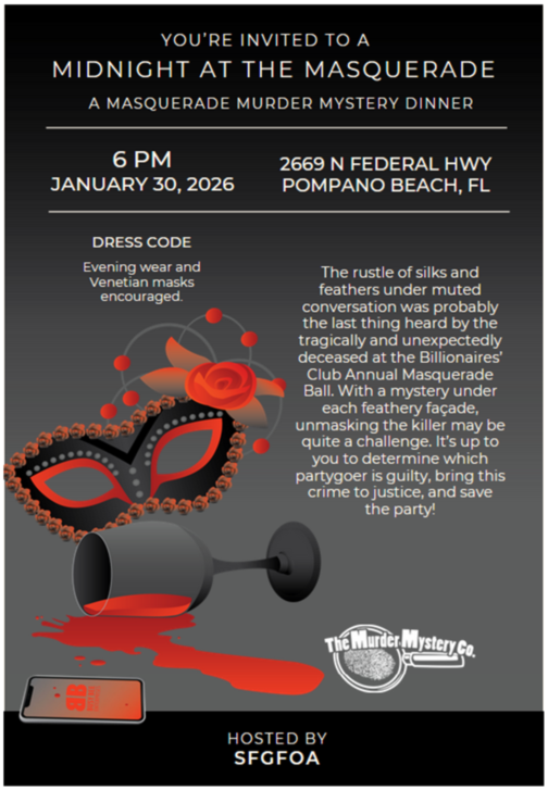 Masquerade Murder Mystery Dinner.  Each paid attendee will receive 2 drink tickets.